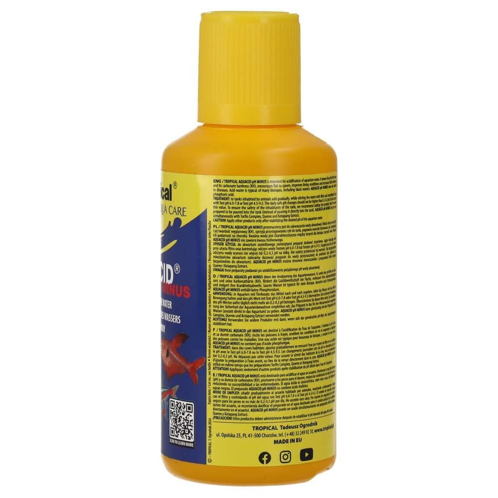 A preparation for lowering the pH level in freshwater aquariums. Acidic water is typical for many biotopes inhabited by fish such as discus, angelfish, South American cichlids, and characins. Maintaining a low pH level is essential for many species, as it ensures good health, enhances coloration, and promotes successful spawning. AQUACID pH MINUS does not contain phosphoric acid, which could cause algae overgrowth.