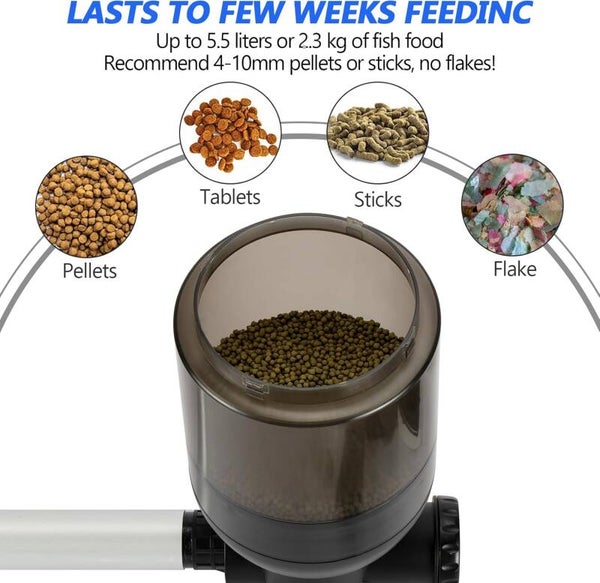 - 👉【Easy To Use】The fish tank feeder has a memory function, which means that the settings are saved when the power is off, and the device resumes operation when the power is restored. The set up and installation operation is simple. Once the feeding interval is selected, the controller will feed according to the scheduled time, ensuring that you will not miss feeding due to holidays or busy weekends. It’s also a great gift for pet owners who have an active lifestyle, love to travel, and more!