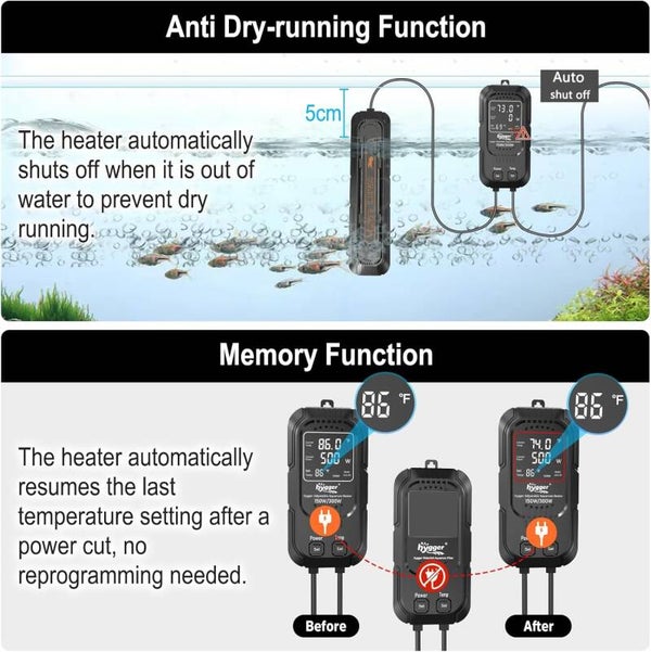 - 【Dual Temperature Control System & Memory Function】This aquarium heater uses a dual temperature control system. When one temperature control system fails, the other temperature control system starts up. This prevents fish from being cooked by high temperatures and is safer. Temperature adjustment range: 63-94℉, and it has a memory function. When power is restored after a power outage, the adjustable power heater will retain the temperature setting.