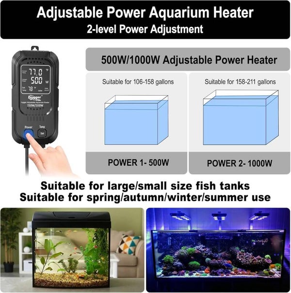 - 【Two-Stage Adjustable Power Design】The adjustable power heater allows you to switch between 400W and 800W heater power. Use low power for small fish tanks and high power for large fish tanks; use low power in spring and summer and high power in autumn and winter. This aquarium heater can meet the needs of different seasons and different sizes of fish tanks.