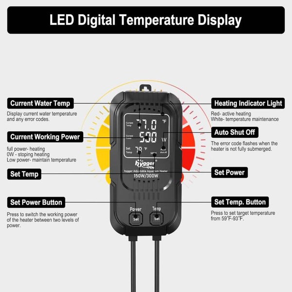 - 【LED Digital Display Controller】The external IC temperature controller for the aquarium heater displays water temperature, set temperature, current operating power, set power, and all error codes. The digital LED display shows the current water temperature and preset temperature (in Fahrenheit), as well as other features such as minimum and maximum temperature display (low/high) and automatic shutdown in case of low water levels. The external controller makes setup and operation more convenient. Each touch adjusts the set temperature by 1 Fahrenheit (1°C).