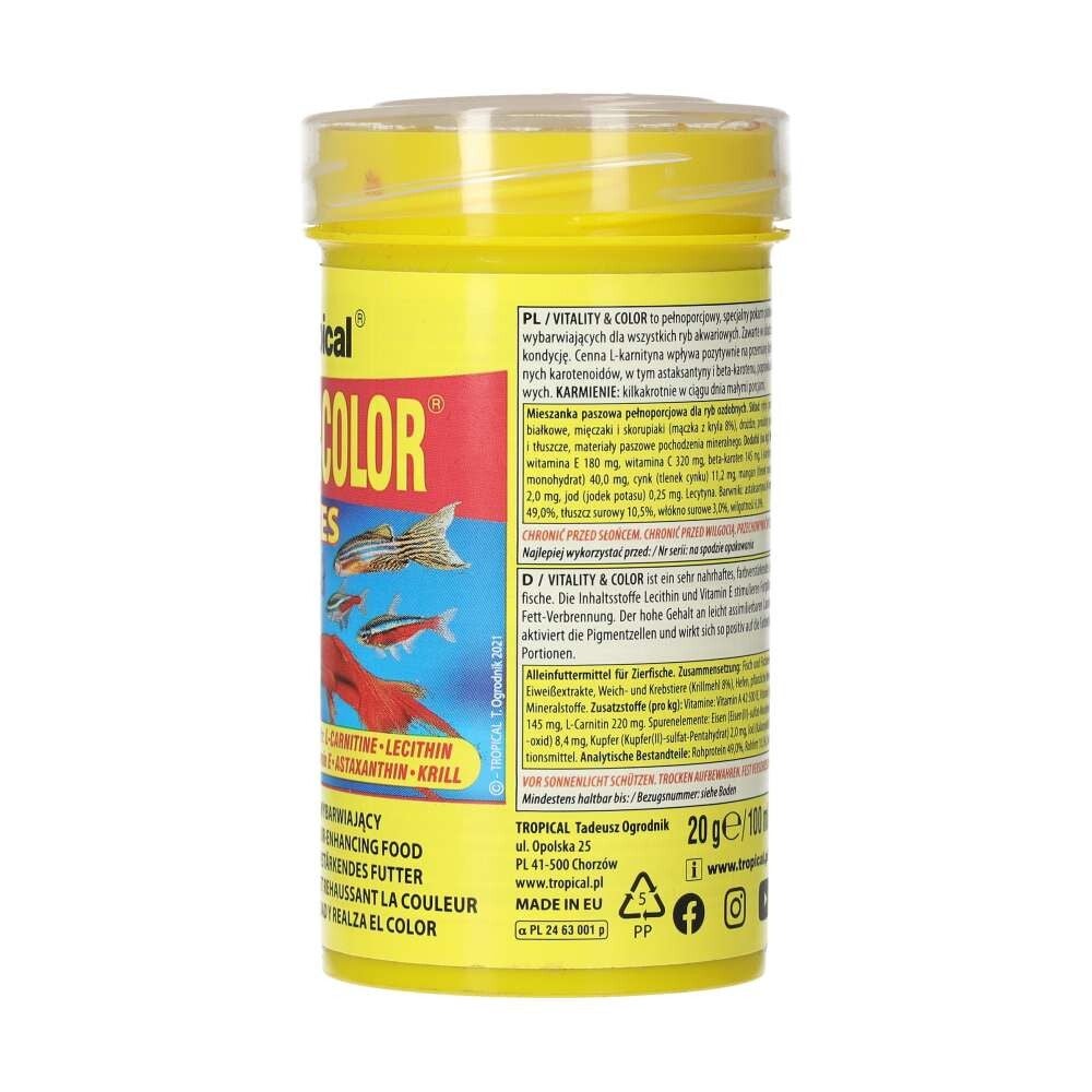 VITALITY & COLOR flakes are a high-protein food with vitality-enhancing and colour-enhancing properties. They can be used for everyday feeding of omnivorous and carnivorous fish, remembering that their diet should be diversified with foods rich in roughage substances such as fibre and chitin to regulate their alimentary tract.