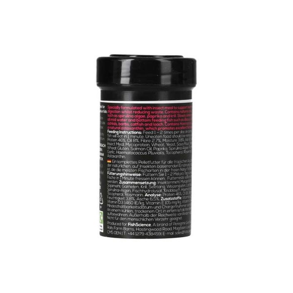 Composition: Insect meal, soya flour, herring meal, cereals, yeast, potato starch, fish hydrolysate, molluscs and crustaceans (krill and shrimp), vegetables (paprika and garlic), salmon oil, algae, lecithin, antioxidants and colourants.