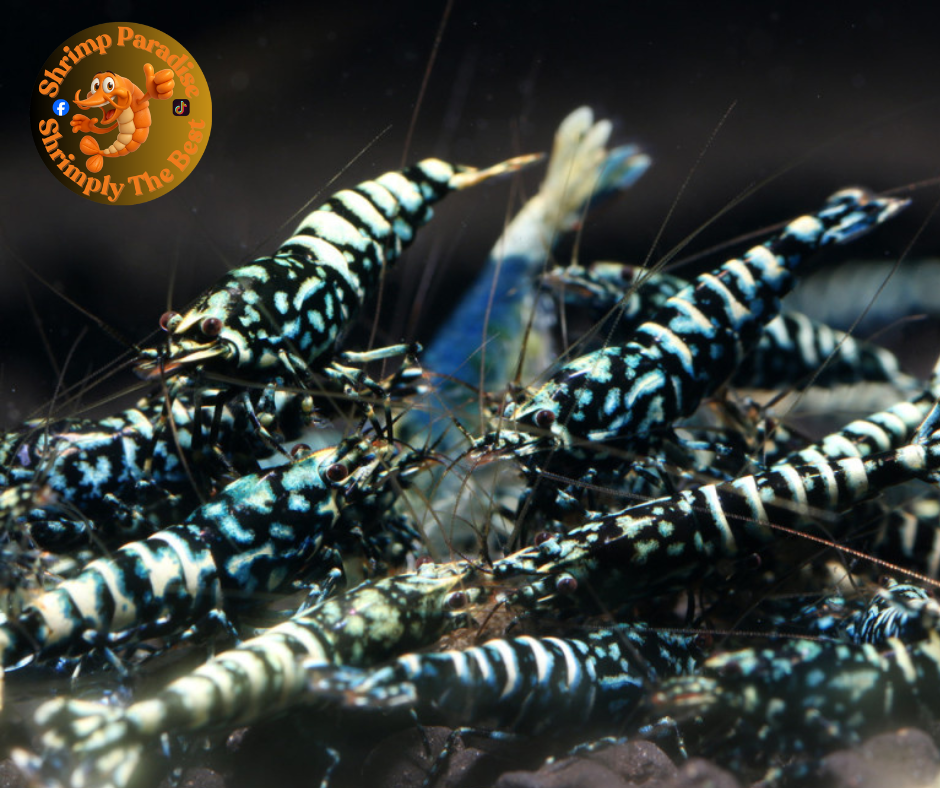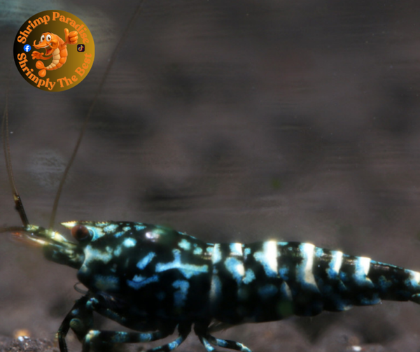 Black body with many spots on the body - shrimp can show blue or green on the white parts once grown into adults