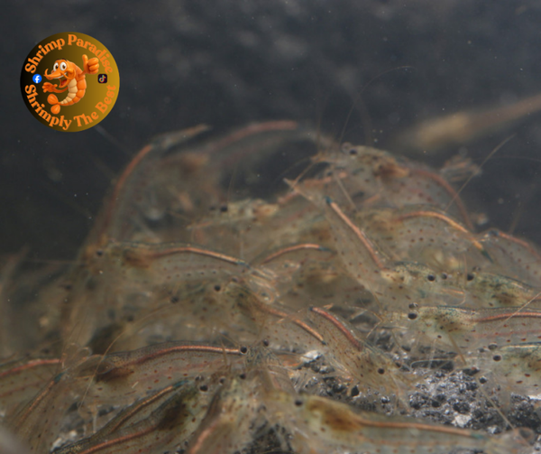 Clear body colour with multiple colour dots. Amano shrimp sometimes showing pinkish or blue hue body.