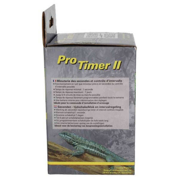 A replaceable battery ensures that the programmed switching times are reliably stored. The switching power of the Lucky Reptile PRO Timer II is 3500W. Shortest switching time: one second.