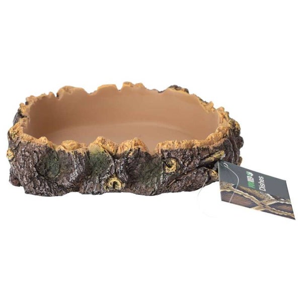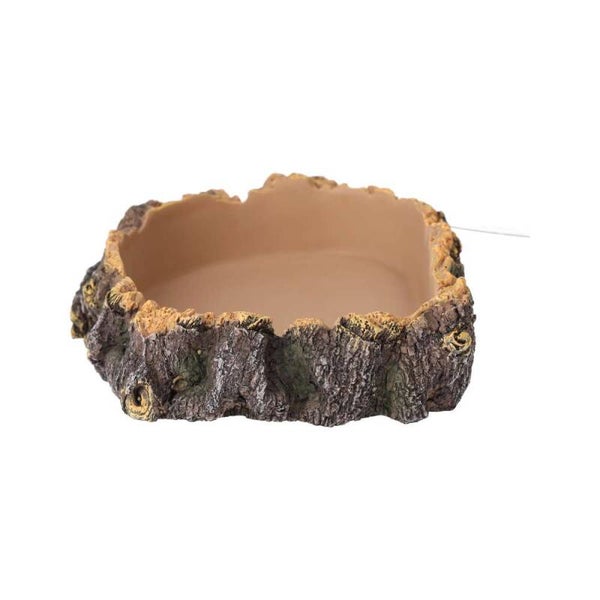 The ProRep Rustic Bark Dish is a resin feeding or water bowl designed with a bark-effect exterior, perfect for enhancing naturalistic terrariums.