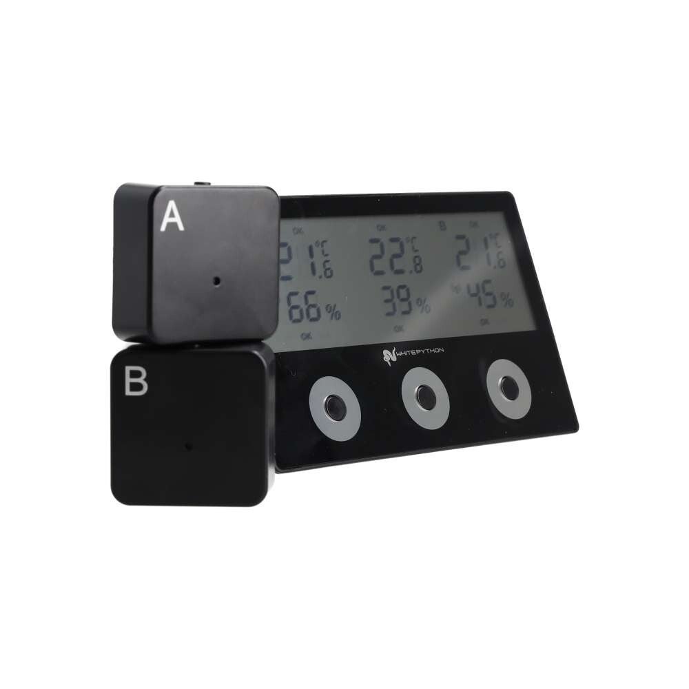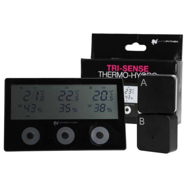 The WhitePython® Tri-sense is a 3-channel wireless thermometer and hygrometer. The Tri-sense thermo-hygrometer provides a simple solution for monitoring multiple enclosures or multiple areas in the same enclosure.