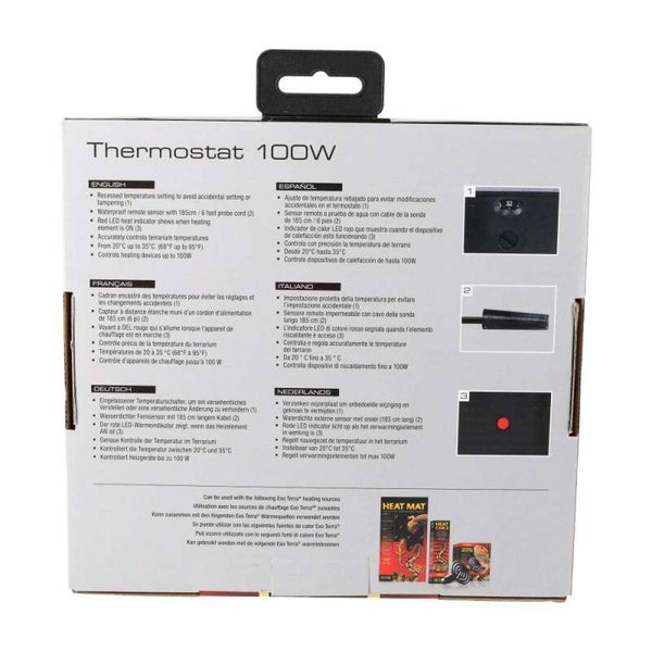 The Thermostat will also help to prevent overheating and undercooling during hot summer days or cold winter nights. The electronic Triac switch keeps the temperature at the desired setpoint with a much higher accuracy compared to conventional thermostats and virtually eliminates temperature swings in the terrarium. Simply connect your Heat Mat, Heat Cable or Ceramic Heater to the Exo Terra ON/OFF Thermostat, set the preferred temperature and place the heat sensor in the desired spot. The Red LED heat indicator will light up when the heating device is ON and will shut off once the desired temperature has been reached. The recessed dial of the thermostat will prevent accidental temperature change if the device is being handled. The Thermostat comes with a 3.6 foot / 110cm power-cord with grounded plug & receptacle for increased safety and to allow the use of a power outlet strip. The waterproof remote sensor can be safely used in highly moist terrariums and aquatic environments.