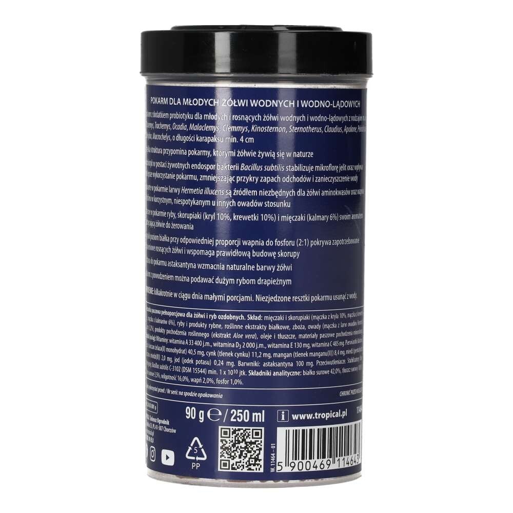• Specially formulated food with probiotics for young and growing aquatic and semi-aquatic turtles, including species such as Mauremys, Trachemys, Ocadia, Malaclemys, Clemmys, Kinosternon, Sternotherus, Claudius, Apalone, Pelodiscus, Chelydra, and Macrochelys (for turtles with a minimum carapace length of 4 cm)