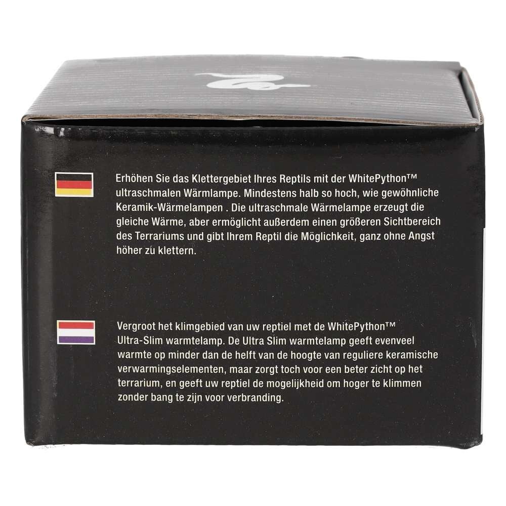 The WhitePython Ultra Slim Ceramic Heat Lamps bring a simple yet professional approach to reptile keeping. Each lamp offers the same level of heat as competing ceramic bulbs but is less than half the height. This shortened heat lamp offers more space for your reptile to climb and bask under the heat whilst also offering an aesthetically more pleasing terrarium with greater viewing area. The Ultra Slim heaters provide a radiant heat source without emitting any light; making them suitable for both day and night use. The infra-red method of heating allows for a basking area directly under the heater, whilst also increasing the ambient temperature of the terrarium.