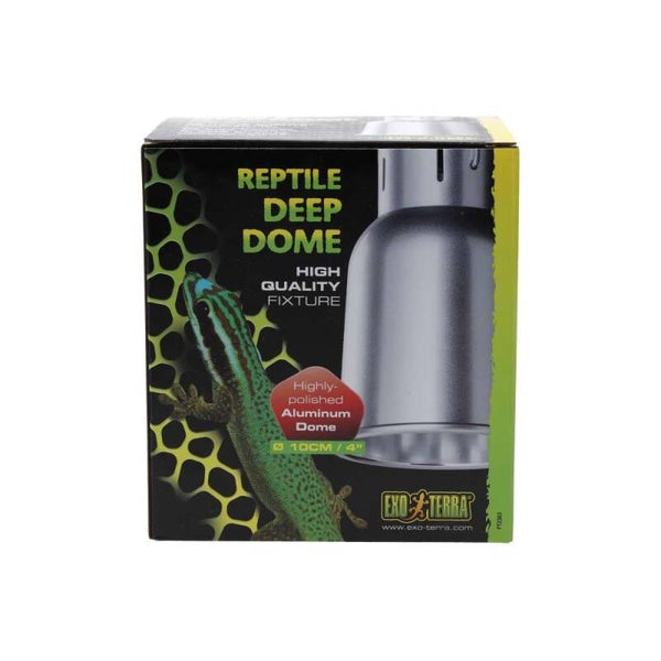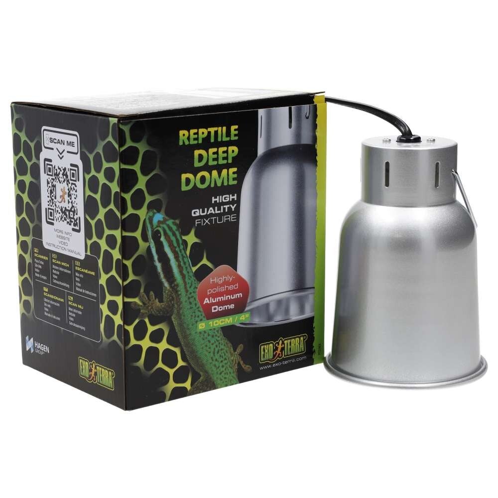 The compact design of Exo Terra’s Reptile Deep Dome NANO makes it an ideal fixture for smaller terrariums, like the Exo Terra Natural terrarium NANO or MINI. The Reptile Deep Dome NANO Fixture gives you the versatility of placing heat, UVB and/or light sources on your terrarium where needed. The highly-polished aluminum reflector increases the light, UVB and heat output significantly! Its heat resistant ceramic socket accommodates incandescent bulbs up to 40W max. The light can be easily switched on and off by the On/Off switch, mounted on the extra long power cord (180 cm – 6 ft).