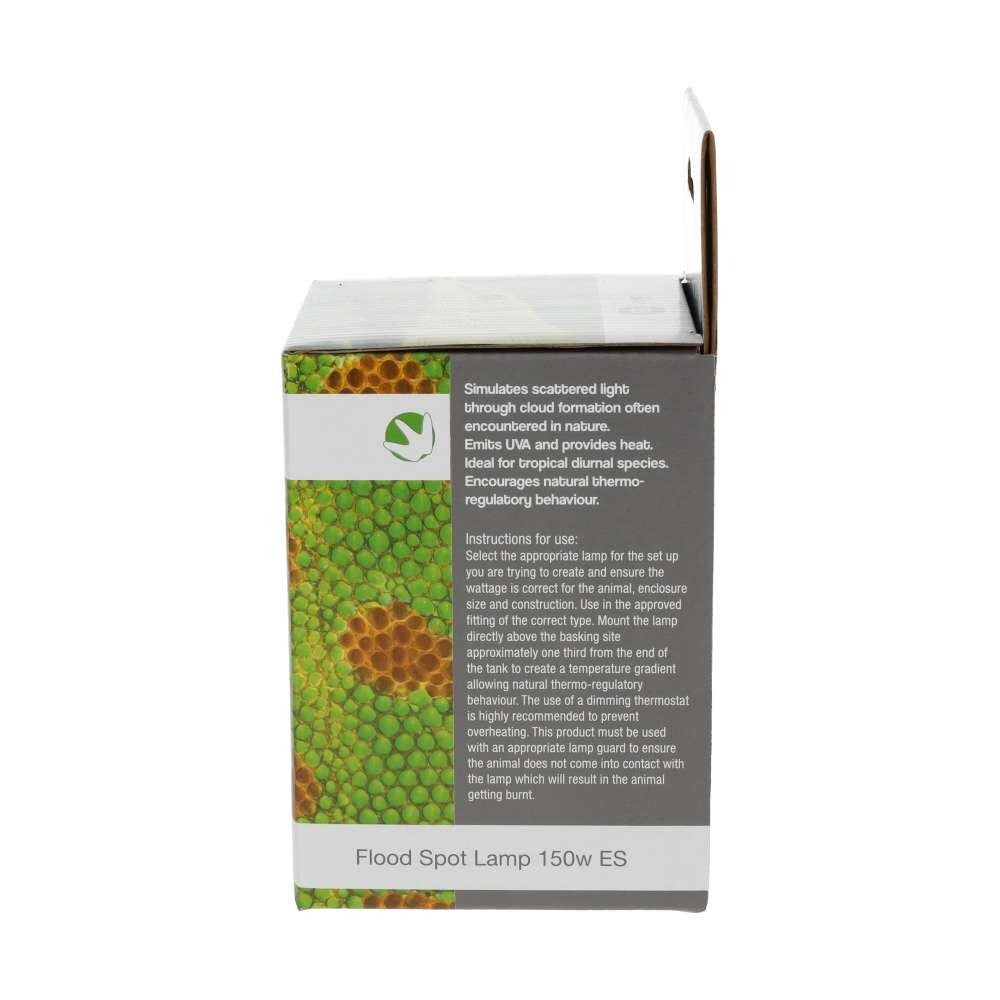 The ProRep Flood Spot Lamp 150w E27 is the most powerful in the range, designed for large reptile, amphibian, and invertebrate enclosures. It provides strong visible light, short-wave infrared heat, and low levels of UVA, with a diffused coating to spread energy evenly across the habitat. This ensures effective basking zones without creating dangerous hot spots, supporting natural behaviour in heat-loving species.