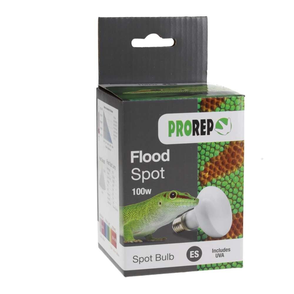 The ProRep Flood Spot Lamp 100w E27 delivers higher output heat and light, perfect for medium to large enclosures. Emitting visible light, short-wave infrared heat, and low levels of UVA, its diffused design ensures energy is spread evenly throughout the habitat, eliminating hot spots and maintaining safe basking conditions.