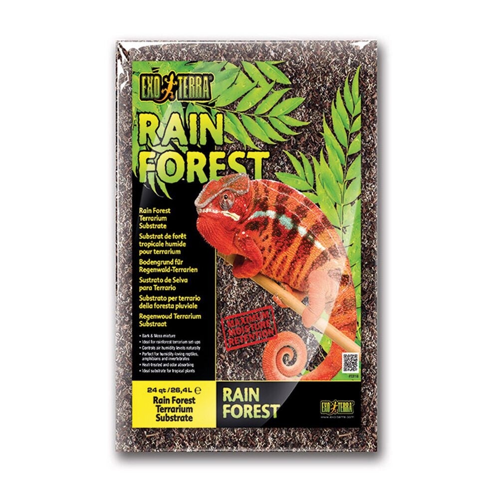 The Exo Terra® Rain Forest is a 100% natural, biodegradable reptile substrate mixture made from sustainable Maritime Pine & Sphagnum Moss. Rain Forest Terrarium Substrate is the ideal decorative substrate to create natural planted terrarium set-ups for humidity-loving reptiles, amphibians and invertebrates from tropical rainforest environments. The Rain Forest substrate regulates the terrarium’s humidity in a natural way by absorbing and slowly releasing moisture. Its hygroscopic properties is maximized by adding natural sphagnum moss to the mixture. Adequate air humidity levels aid in shedding and help prevent respiratory infections. The unique size and shape of the bark particles, in combination with natural sphagnum moss, allow frequent irrigation of your plants while still providing good aeration for healthy root growth. Exo Terra® Rain Forest is heat-treated to reduce bacterial contamination.