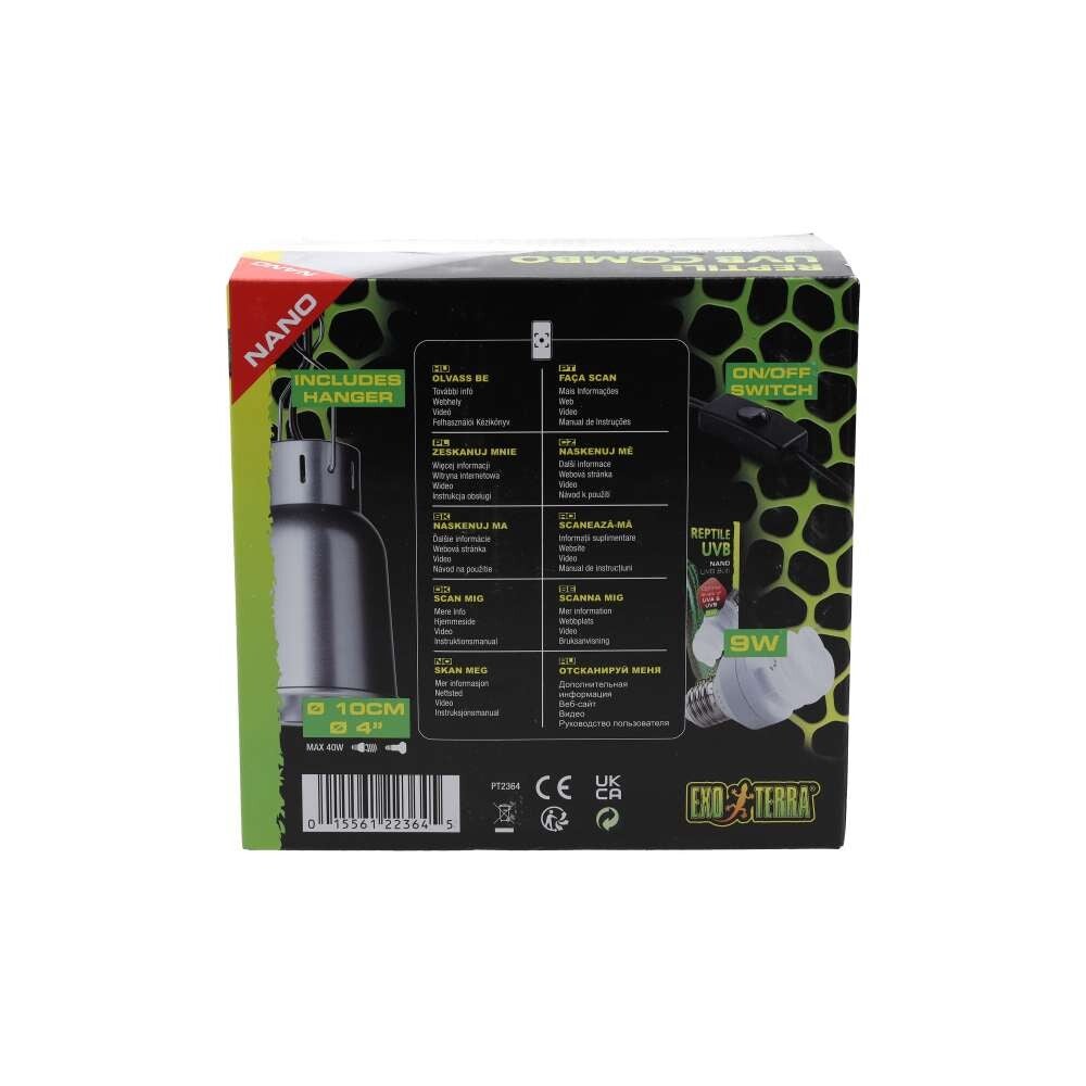 Exo Terra’s Reptile Deep Dome UVB Combo is an ideal lighting combination for smaller terrariums, like the Exo Terra Natural terrarium NANO or MINI. It combines the stylish and compact design of the Reptile Deep Dome NANO with Exo Terra’s Reptile UVB NANO bulb. The Reptile Deep Dome NANO Fixture gives you the versatility of placing heat, UVB and/or light sources on your terrarium where needed. The highly-polished aluminum reflector increases the light, UVB and heat output significantly! Its heat resistant ceramic socket accommodates incandescent bulbs up to 40W max. The light can be easily switched on and off by the On/Off switch, mounted on the extra long power cord (180 cm – 6 ft). The Exo Terra Reptile UVB NANO bulb emits optimal levels of UVA & UVB and is an excellent UV source for Nano Terrarium setups. The bulb’s optimal Vitamin D3 yield index ensures vitamin D3 photosynthesis to aid calcium absorption and prevent metabolic diseases while the UVA rays will contribute to the animal’s overall wellbeing.