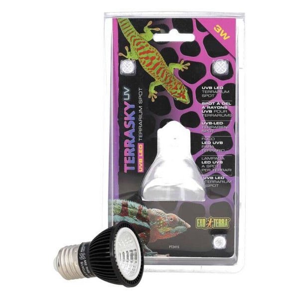 The Exo Terra® TerraSky UV LED Terrarium Spot use very durable LED chips that produce Light, UVA and UVB rays for up to 20,000 hours or 4+ years!