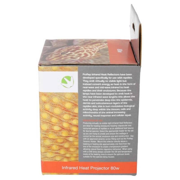 The ProRep Infrared Heat Projector 80w delivers a higher-output heat source for reptiles, amphibians, and invertebrates. Using near-wave and mid-wave infrared, it penetrates deep into the skin and tissues, stimulating biological processes, thermoregulation, activity, and cellular repair. It emits no visible light, making it suitable for 24-hour use. Perfect for larger enclosures or species that require more intense heat.