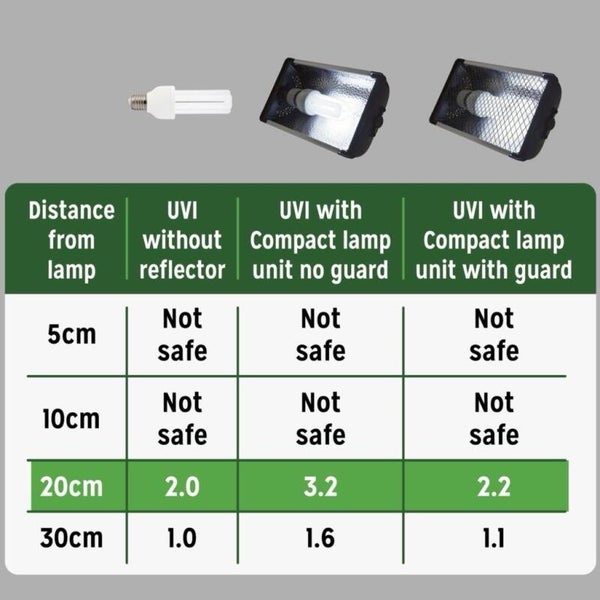 - Zone 2 UVB lamp – average UVI 2.0 at 30cm.